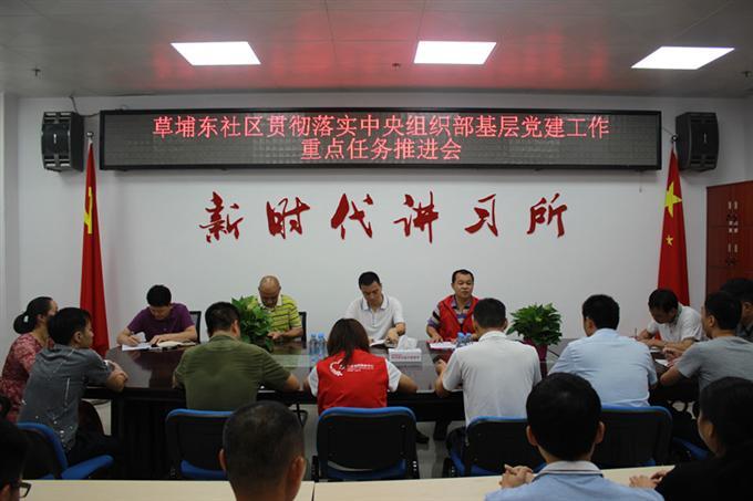 2018年6月6日, 草埔东社区党委开展了贯彻落实中央组织部基层党建工作重点任务推进会。会上,党委书记带领党员干部深入学习了《关于认真贯彻落实中央组织部基层党建工作重点任务推进会精神的通知》,会议要求,各党员同志通过学习,要提高认识,明确要把党建工作摆在突出的位置,把思想政治建设摆在首位,真正从思想上重视基层党组织建设,发挥党员先锋模范作用。实实在在抓好党员培养、增强组织战斗力,推进组织规范化、信息化、实效化,以党建工作考核为抓手,突出党建引领作用。