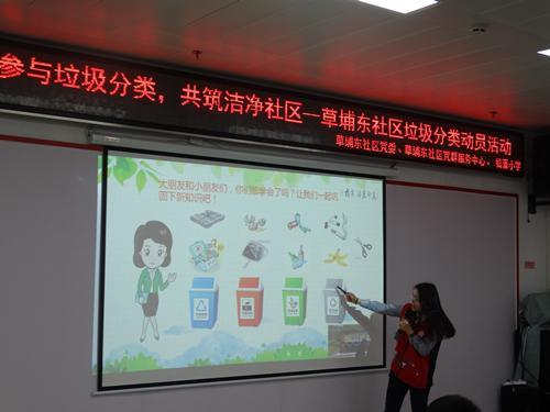 为提高社区居民对垃圾分类的了解和加快推进生活垃圾分类工作。2019年4月12日下午,在草埔东社区党委的支持下,社区党群服务中心联合松源小学面向60名学生及其家长开展了一场以垃圾分类为主题的动员活动。
