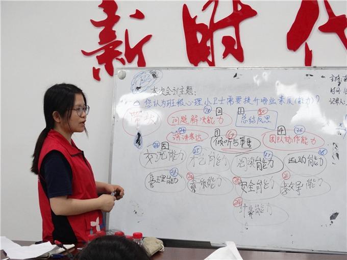 本次会议由社工负责主持,心理小卫士队伍副队长负责会议内容记录,以焦点小组的形式,以“您认为班级心理小卫士需要提升哪些素质”为议题进行讨论,小卫士先进行15分钟的独立思考并在表格上写出需求,并从各自的角度对相应素质给予适宜的分数,社工在此过程中对小卫士的发言适当进行澄清与聚集,并记录下15项素质,最后根据每项累计分数通过举手表决的形式决定出2019年针对班级心理小卫士开展的6项能力训练重点。5 R& r/ M* ]- B: c