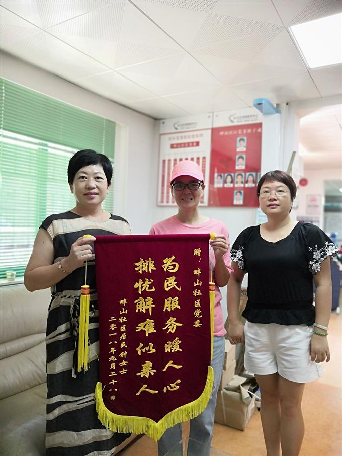 2018年9月28日,畔山社区的居民钟女士带着对社区满满的情谊为畔山社区敬赠了一面写着“为民服务暖人心 排忧解难似亲人”的锦旗,感谢畔山社区党委对她们全家的关心和给予的帮助。 畔山社区全心全意为我们居民服务,及时解决急难愁困难,是我们居民的真正贴心人。”社区居民钟女士真切的说。畔山社区党委书记赵瑞璇表示:“为社区居民群众服务,是我们社区应该做的,您们在今后的生活中再遇到难处,我们也将不遗余力继续给予社区最大的帮助。” 通过社区居民为我们送来感谢的锦旗,这不仅是对我们社区工作的肯定和认可,同时我们也把它作为今后更好地为社区居民群众服务的鞭策。群众的满意就是我们工作的动力和源泉,我们畔山社区全体党员同志今后会尽全力为社区群众提供更多更好的服务,让社区居民群众感受到社区大家庭亲人般的温暖。 畔山社区发言人:周小勇
